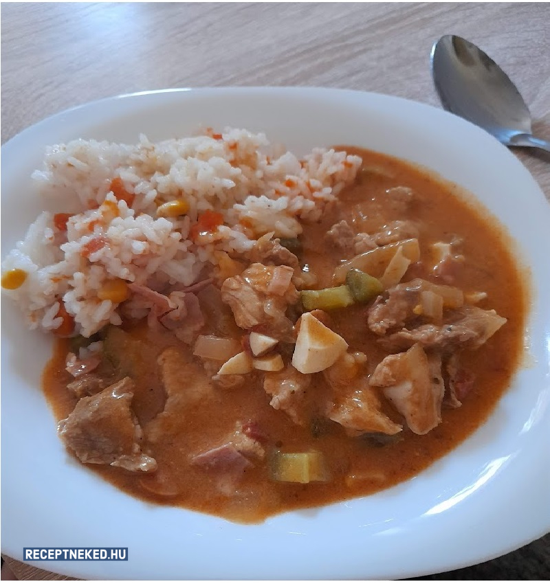 A maradék hagymát illetve egy kevés szalonnát olajon üvegesre párolok, majd megszórom pirospaprikával és jól összekeverem. Ezen a hagymás alapon megsütöm a húsokat. Végül felöntöm vízzel és készre főzom.