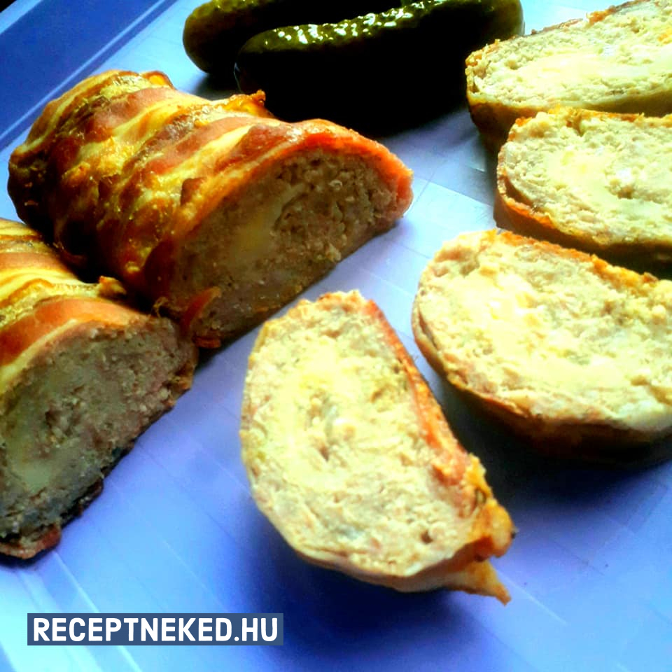 Egy nagyobb darab folpack fóliát terítsünk el az asztalon, majd kb. egy cm vastagságúra lapogassuk el rajta a húsmasszát, majd közvetlenül a húsmassza egyik végénél fektessük le a bacon szeleteket (a bacon szeletek kicsit fedjék egymást, hogy feltekerésnél teljesen befedje a húsmasszát).