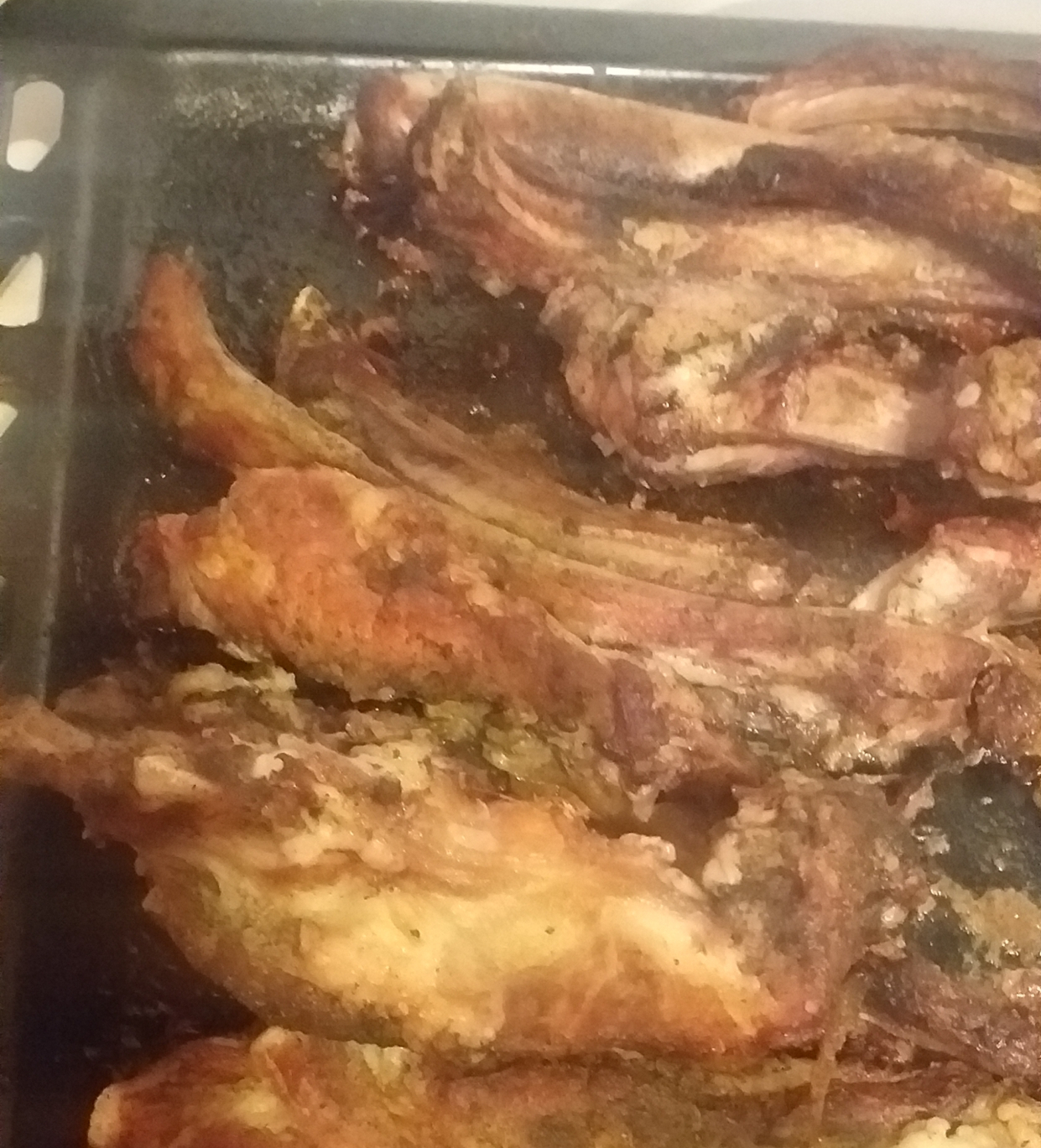 A húst 2 bordánként felvágjuk és megmossuk, majd lecsepegtetjük. Ízlés szerint sózzuk és borsozzuk.