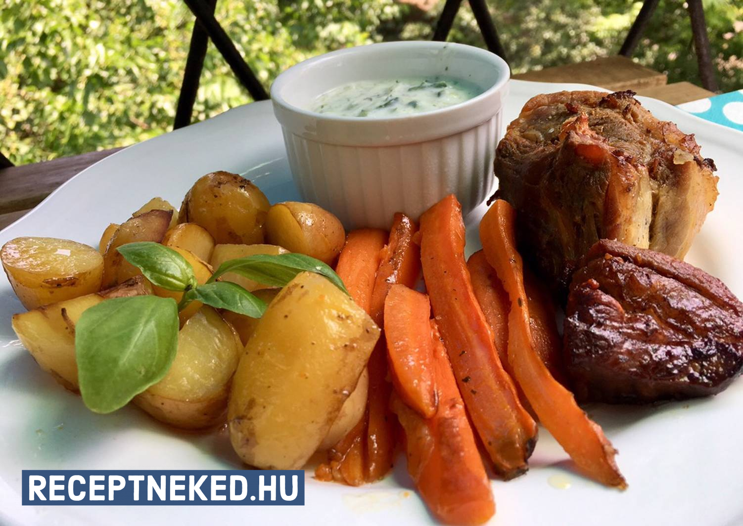 Fedő alatt sütjük. Sütés közben megforgatjuk és az elpárolgott vizet pótoljuk. Félidőben a zúzott fokhagymát rászórjuk.