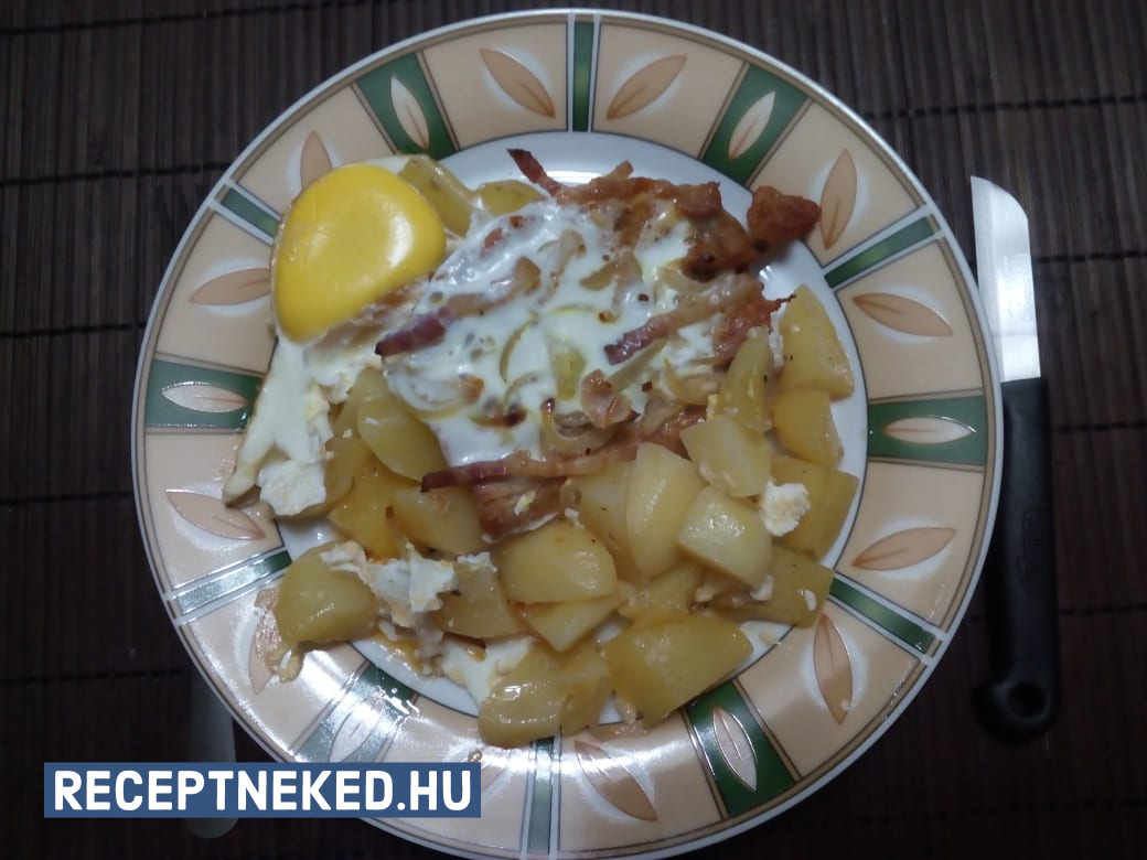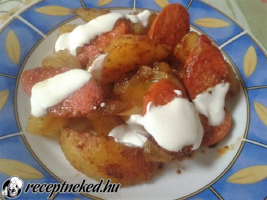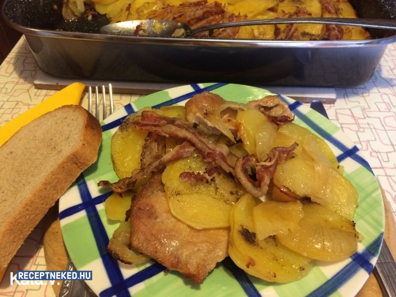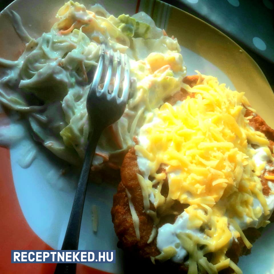 A tejfölhöz adjuk a sót, borsot, reszelt fokhagymát az aprított újhagymát. A tejfölös keveréket a hússzeletekre tesszük és erre először a reszelt sajtot szórjuk, majd a végén a krumplit egyengetjük el rajta.