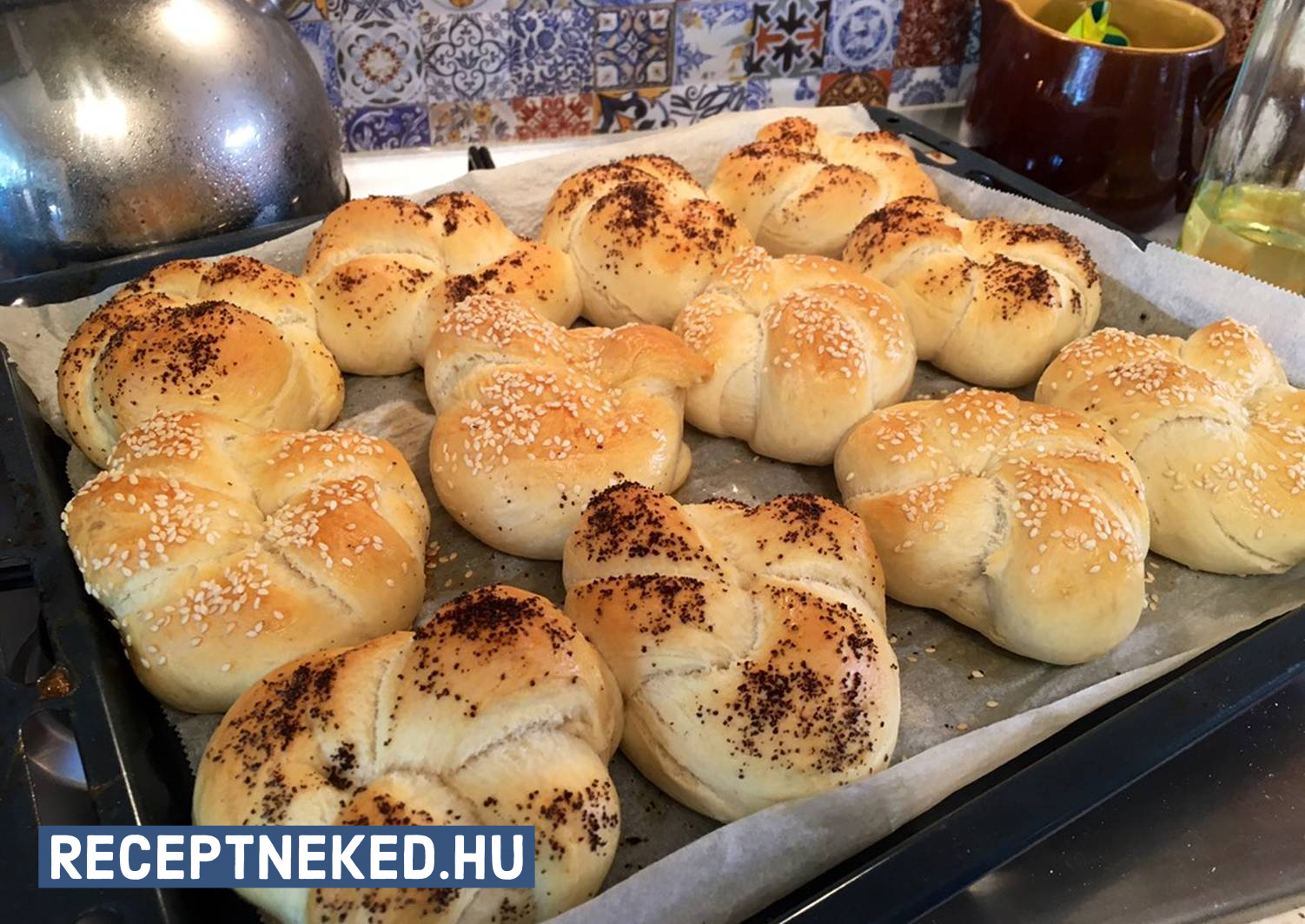 Sütőpapírral bélelt tepsire helyezzük, megkenjük tojásfehérjével és megszórjuk szezámmaggal. Hideg sütőbe toljuk, amit 200 fokra állítunk.