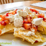 Ezután egyenletesen kanalazzuk rá a túrós tölteléket, majd rakjuk ki a tetejét vékonyra felszeletelt paradicsommal.