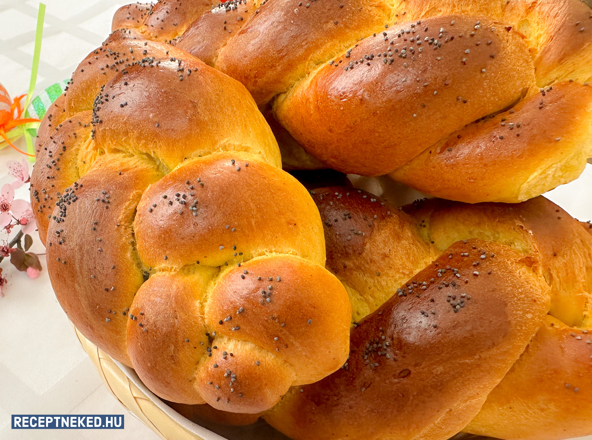 Egyesével kinyújtjuk kb 2 mm-re, téglalap alakúra. Lekenjük zsírral, majd feltekerjük, mint a bejglit. Hármas fonással megfonjuk.