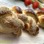 Ez alatt a sütőt előmelegítjük 180 fokra. A megkelt tésztát felvert tojással lekenjük, szezámmaggal megszórjuk és kb 30-35 perc alatt készre sütjük.
