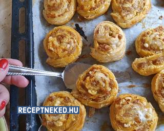 A csigákhoz a kinyújtott téglalapot feltekerjük, mint a piskótatekercset, majd egy éles kés segítségével kb 1,5 cm széles korongokat vágunk le a rúdból.
