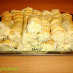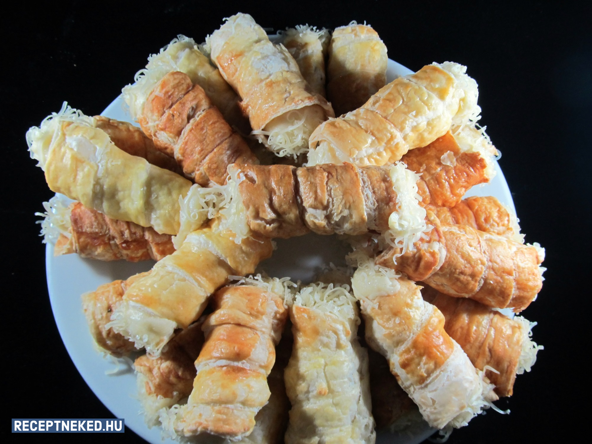 Amíg a krém hűl, elkészítjük a rolókat. A leveles tésztát kinyújtjuk kb. 2-3 mm vastagra. 1 cm széles csíkokra felvágjuk, és a formára rátekerjük.