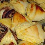A tésztát szorosan feltekerjük. A tejfölt összekeverjük a tojássárgájával, és ezzel megkenjük a tekercsek tetejét. Éles késsel váltakozva balra és jobbra vágva háromszög alakú darabokra szeleteljük, de készíthetünk belőle ujjnyi vastag csigákat is.