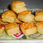 A hozzávalókat összegyúrjuk, kétszer egymás után kinyújtjuk, hajtogatjuk, mint a vajas tésztát.
