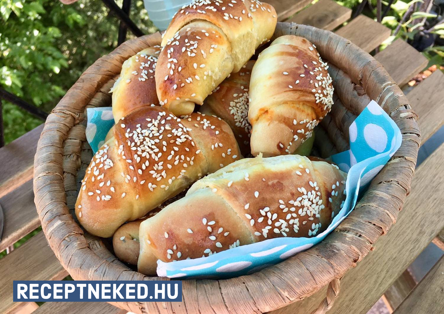 Bekenem mustárral, majd 8 cikkre vágom. Ráhelyezem a szélére a virsliket, feltekerem, majd lekenem tojássárgájával és 10 percet állni hagyom mielőtt a sütőbe tolnám.