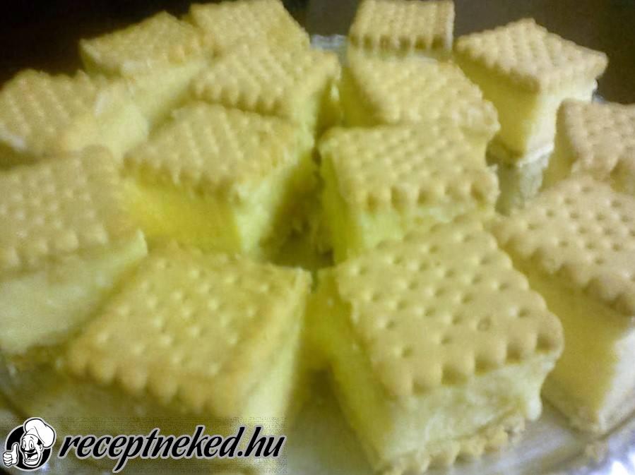 A tepsi aljára egy réteg kekszet lerakunk, szorosan egymás mellé. A kekszre rákenjük a főzött krémet, arra pedig a kemény habot kenjük. Tetejét pedig egy újabb réteg keksszel zárjuk.