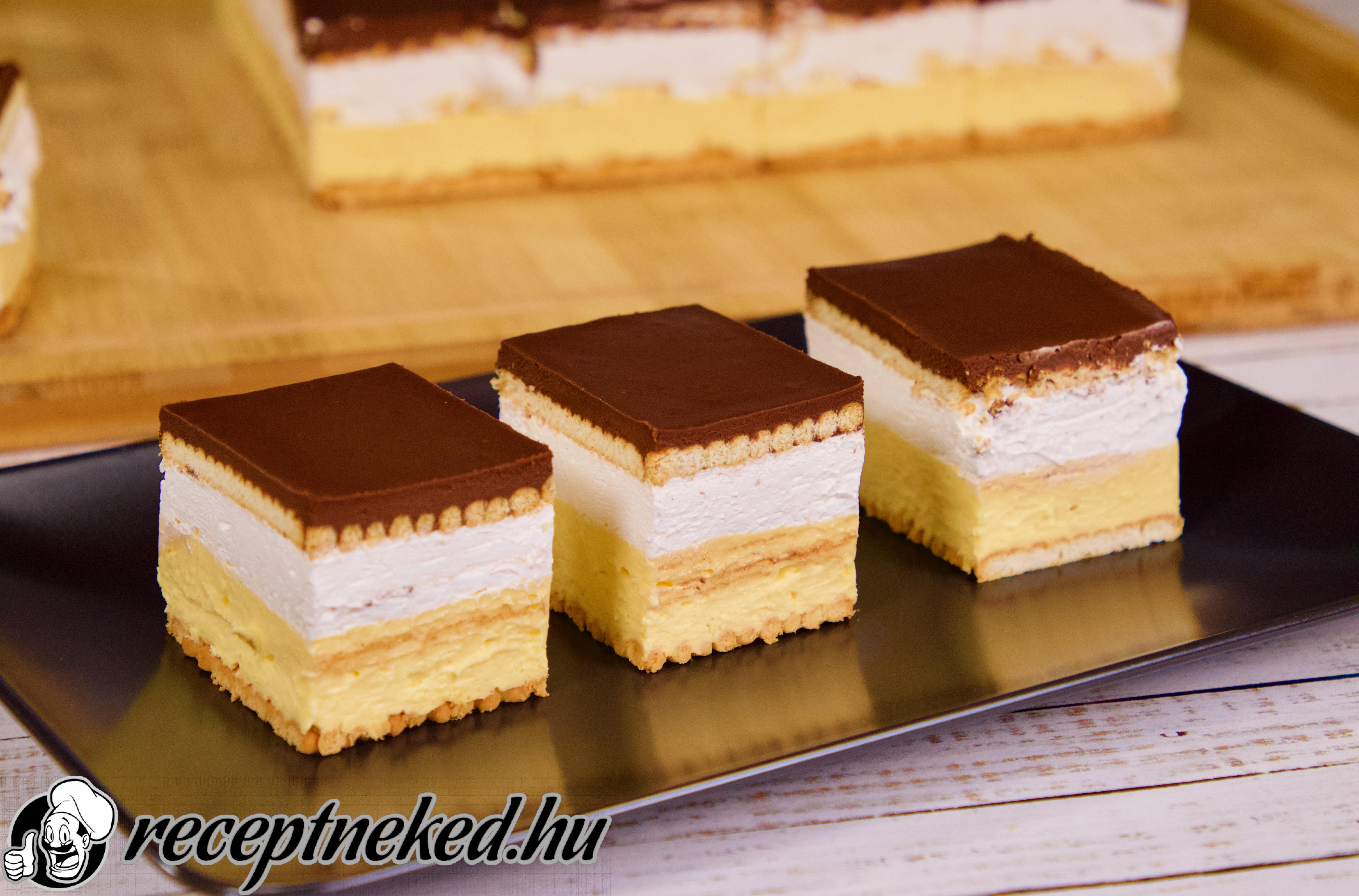 Hűtőbe tároljuk és másnap mikor már a kekszek megpuhultak, szép, egyforma szeletekre felvágjuk (a kekszek mentén érdemes felvágni).
