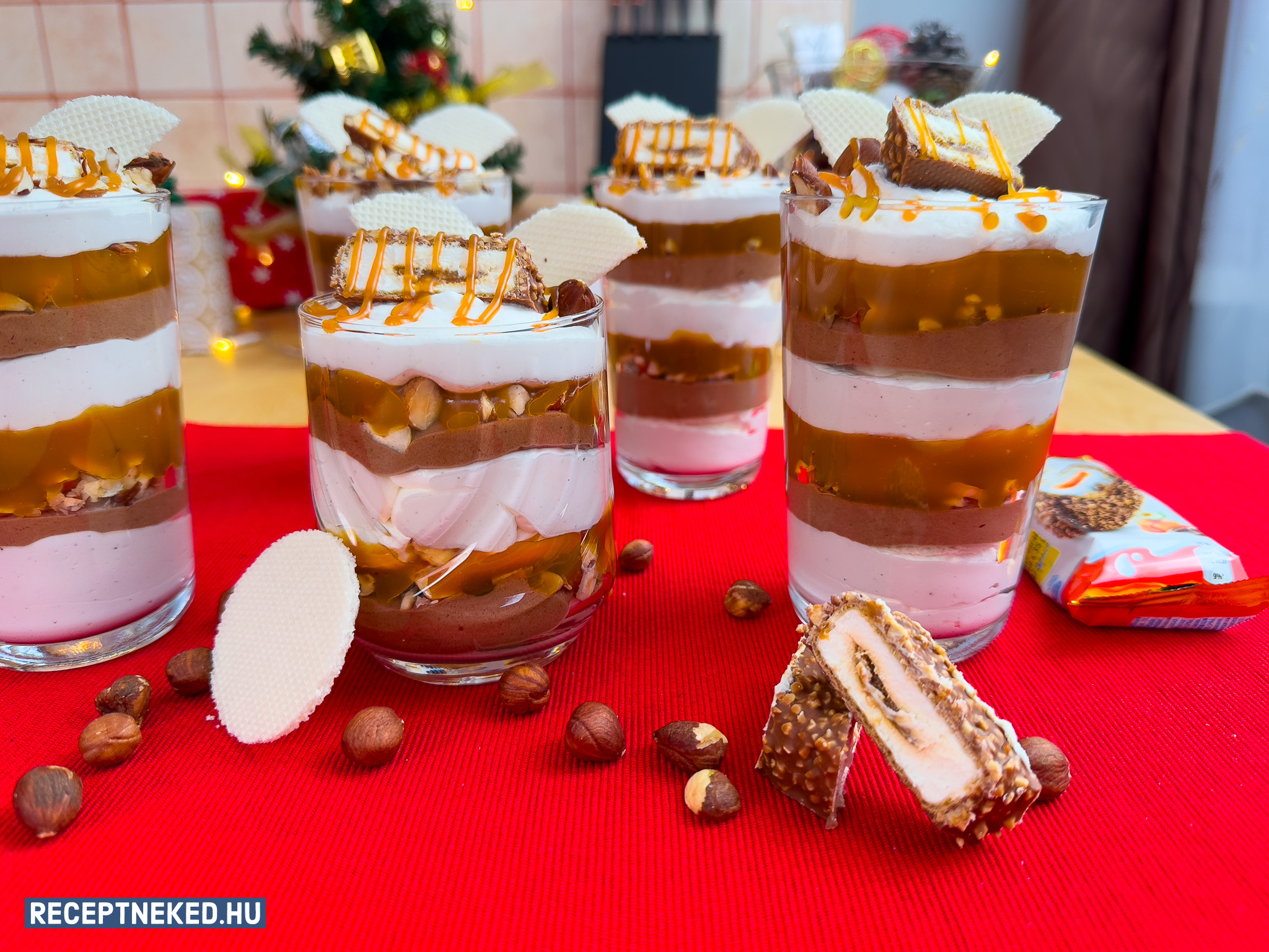 A mogyorókrémet gőz felett vagy mikróban felmelegítjük és egyenlően elosztva a poharakba rakjuk.