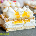 A kekszből leteszünk egy réteget egy 28*18 cm-es forma vagy keret aljába és a krém 1/3-át rákenjük egyenletesen. Újabb réteg keksz, majd a krém következő harmada és újra keksz következik. Végül rákenjük egyenletesen a maradék krémet és a tetejét kitesszük keksszel.