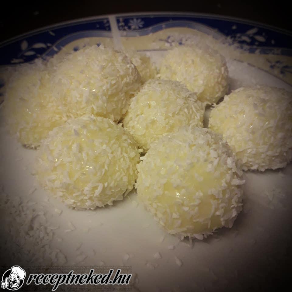Egy kevés kókuszreszeléket megpirítunk száraz serpenyőben, ezzel szórjuk meg a desszertet.