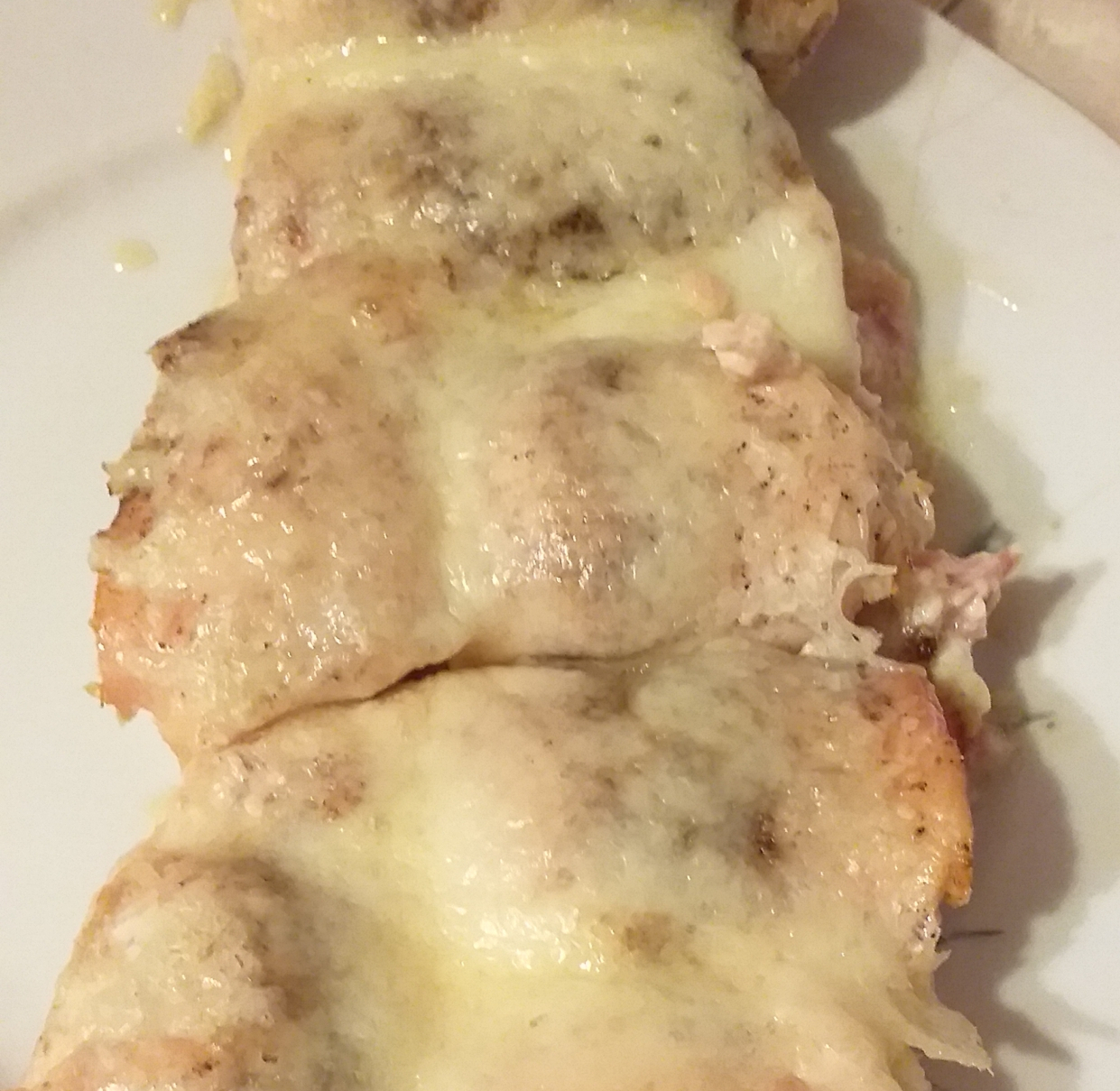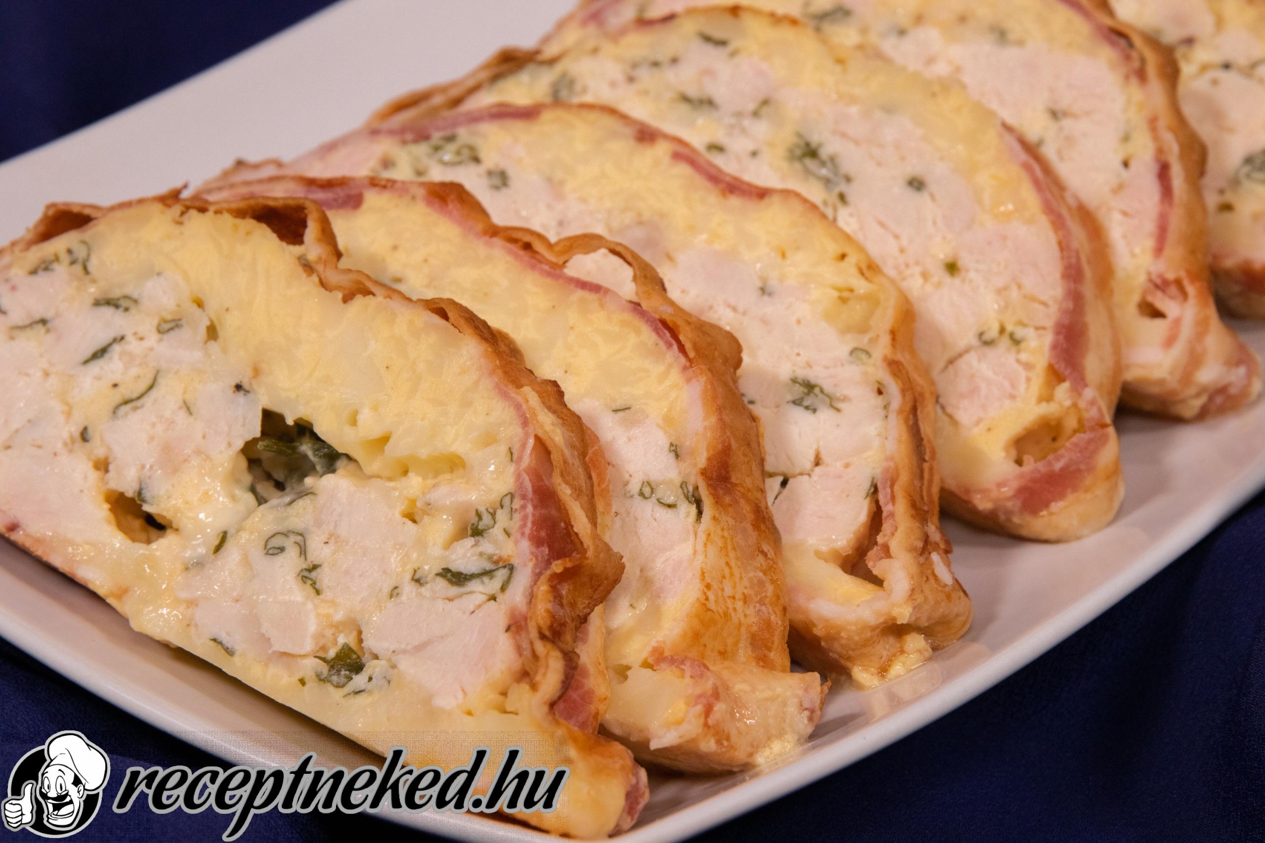 Amikor megsült kifordítjuk a formából a sütőpapíros tepsire, megszórjuk reszelt sajttal és addig pirítjuk míg a szalonna nem kap egy kis színt és a sajt el nem olvad rajta.