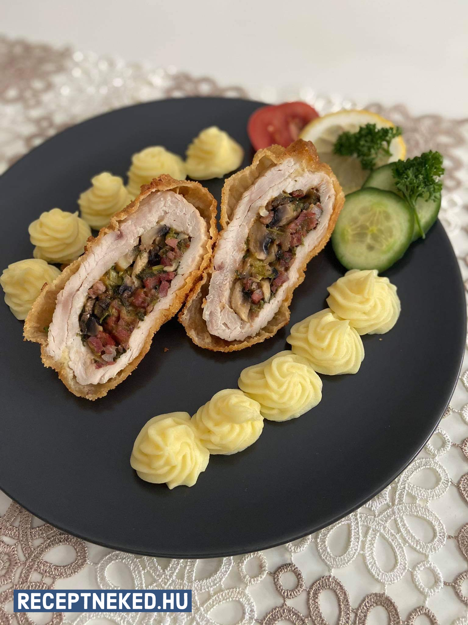 A felkockázott húst adjuk hozzá a sajtos-tejfölös masszához.