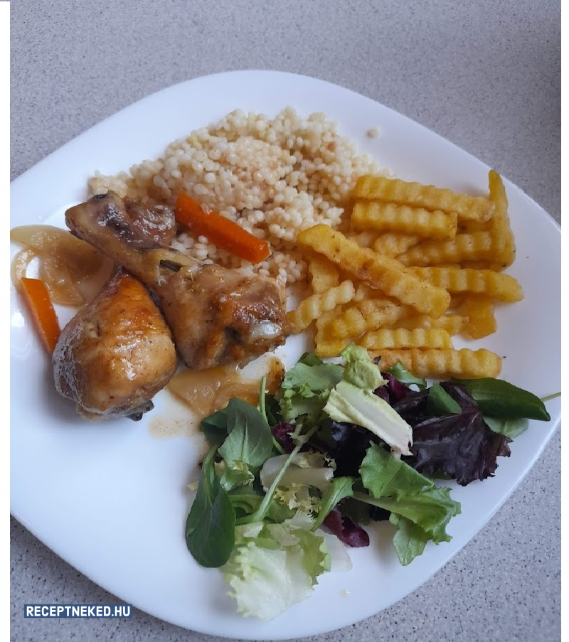 Mézből, mustárból, olajból és pirospaprikából kencét készítünk, amivel jól átkenjük a csirkecombokat. A maradék keveréket félretesszük.