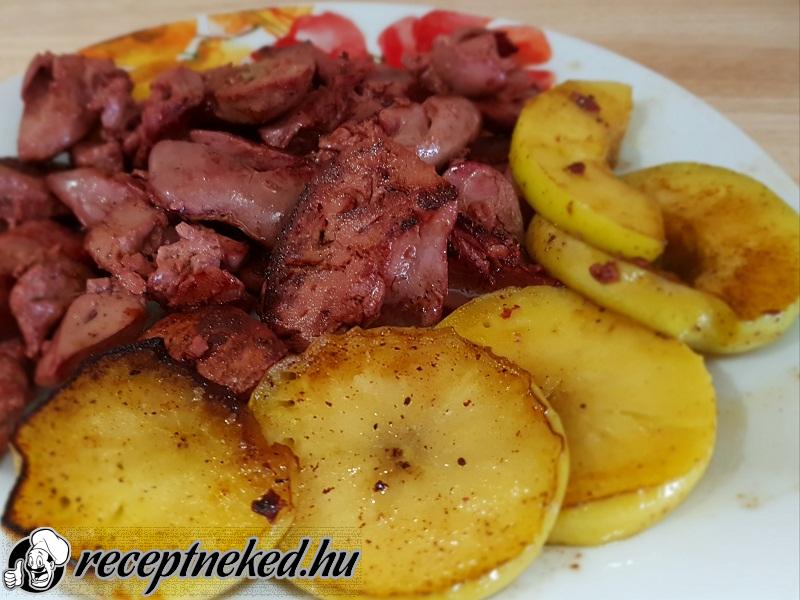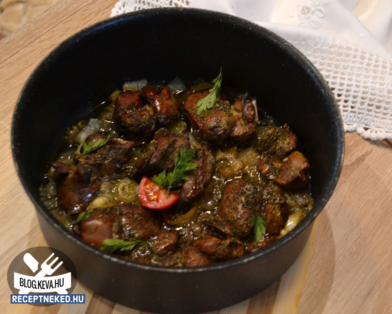 A hagymát meghámozzuk és felaprítjuk. A zsírt felmelegítjük, majd üvegesre pirítjuk rajta a hagymát, ezután rátesszük a megmosott és tisztított májat. Megszórjuk őrölt borssal és fedő alatt pár percig pároljuk.