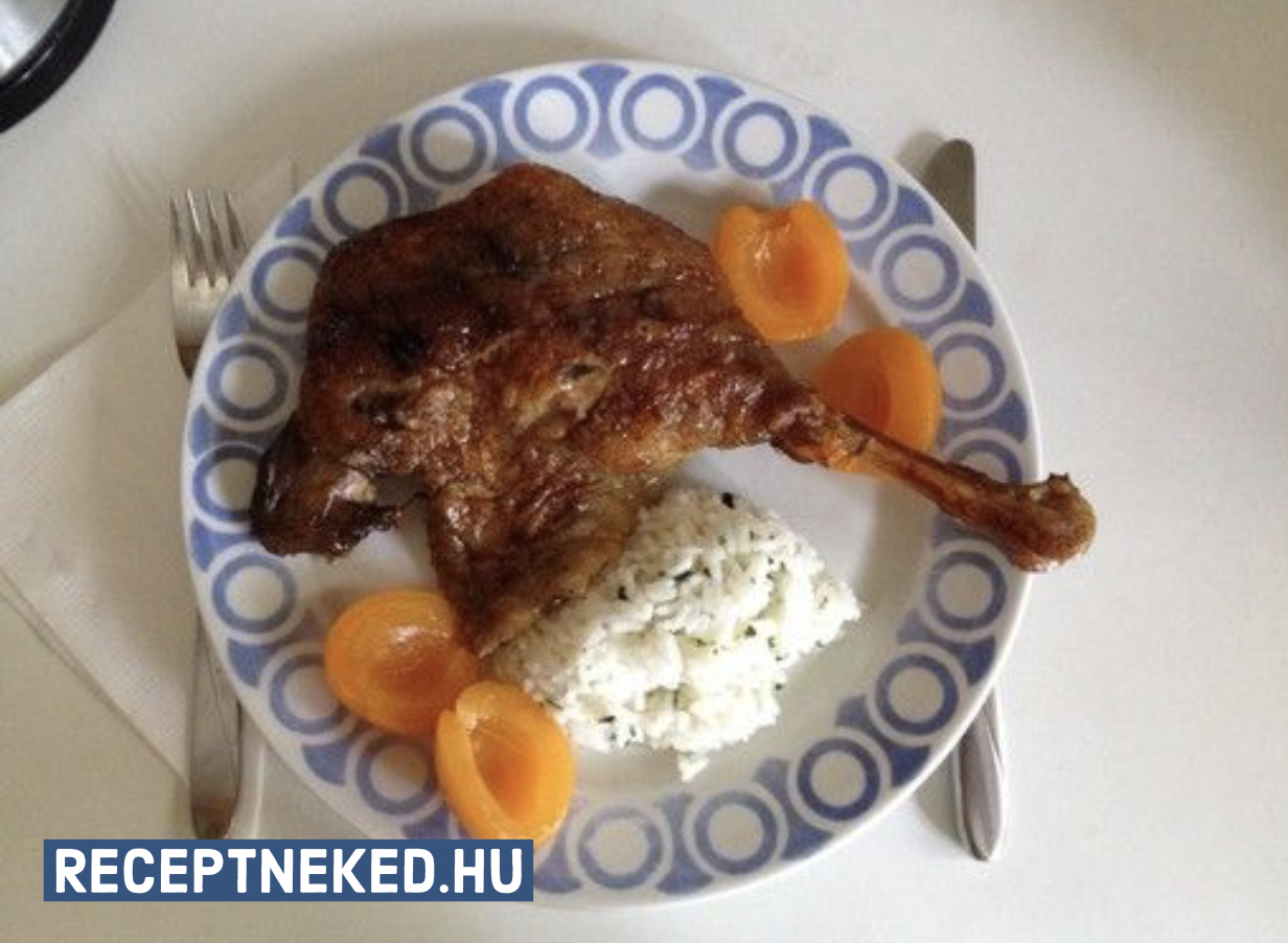 Az utolsó fél órában elkészítjük a köretet. 1 ek olajon fehéredésig pirítjuk rizst. Hozzáadjuk a leveskockát, megszórjuk szárított petrezselyemmel és fokhagymaporral. Felöntjük 0,5 l forrásban lévő vízzel. Alaposan átkeverjük, lefedjük és lekapcsoljuk alatta a kerámialapot. A maradék hőtől 20 perc alatt teljesen megpuhul.