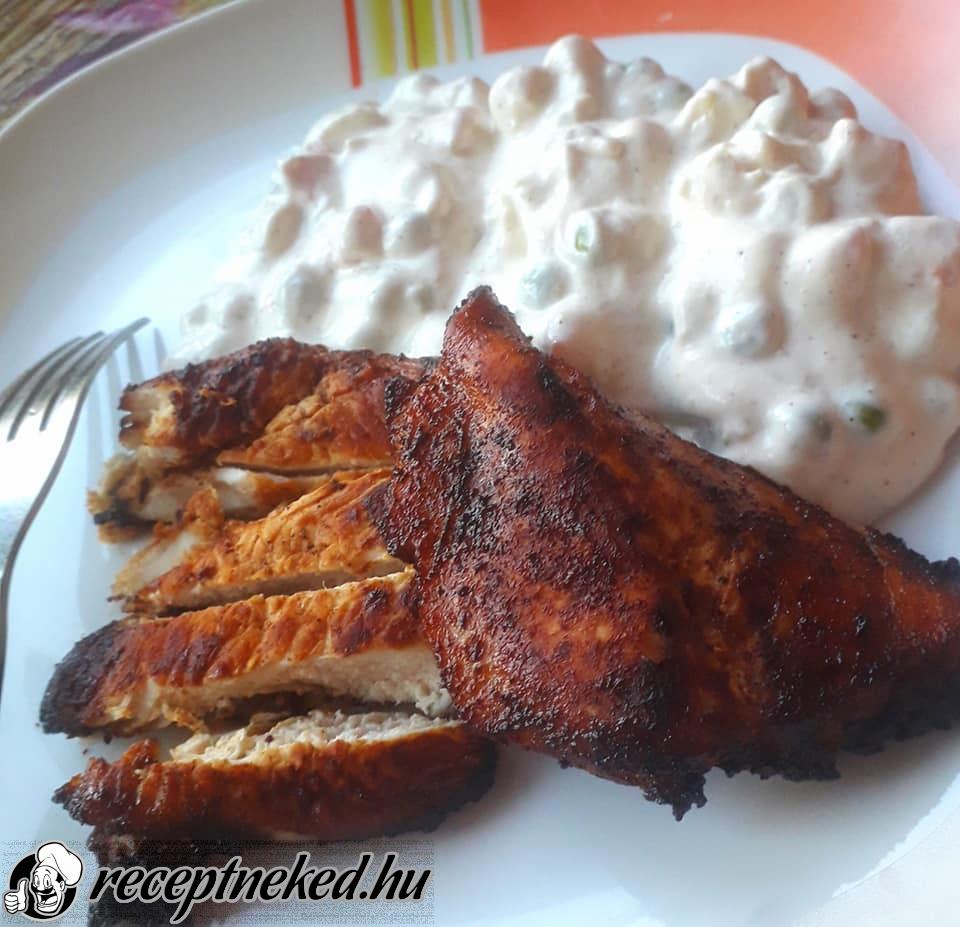 A húst felszeleteljük, sózzuk, ízlés szerint fűszerezzük, bekenjük mustárral, és negyed órát állni hagyjuk.