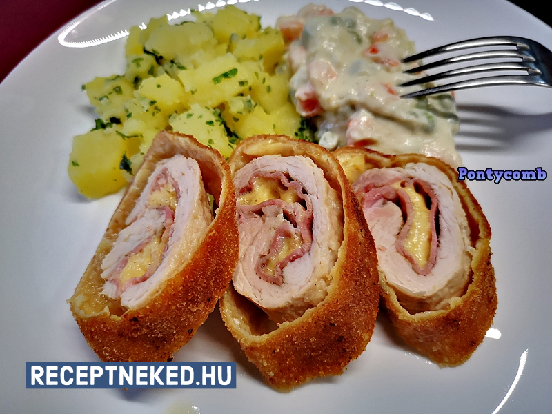 A kivágott pulyka tallérra rakjunk egy szelet pulykamell sonkát. A sonka tetejére rakjunk egy adag tölteléket. A tölteléket fedjük be egy szelet hússal, majd jól nyomkodjuk össze a széleit.