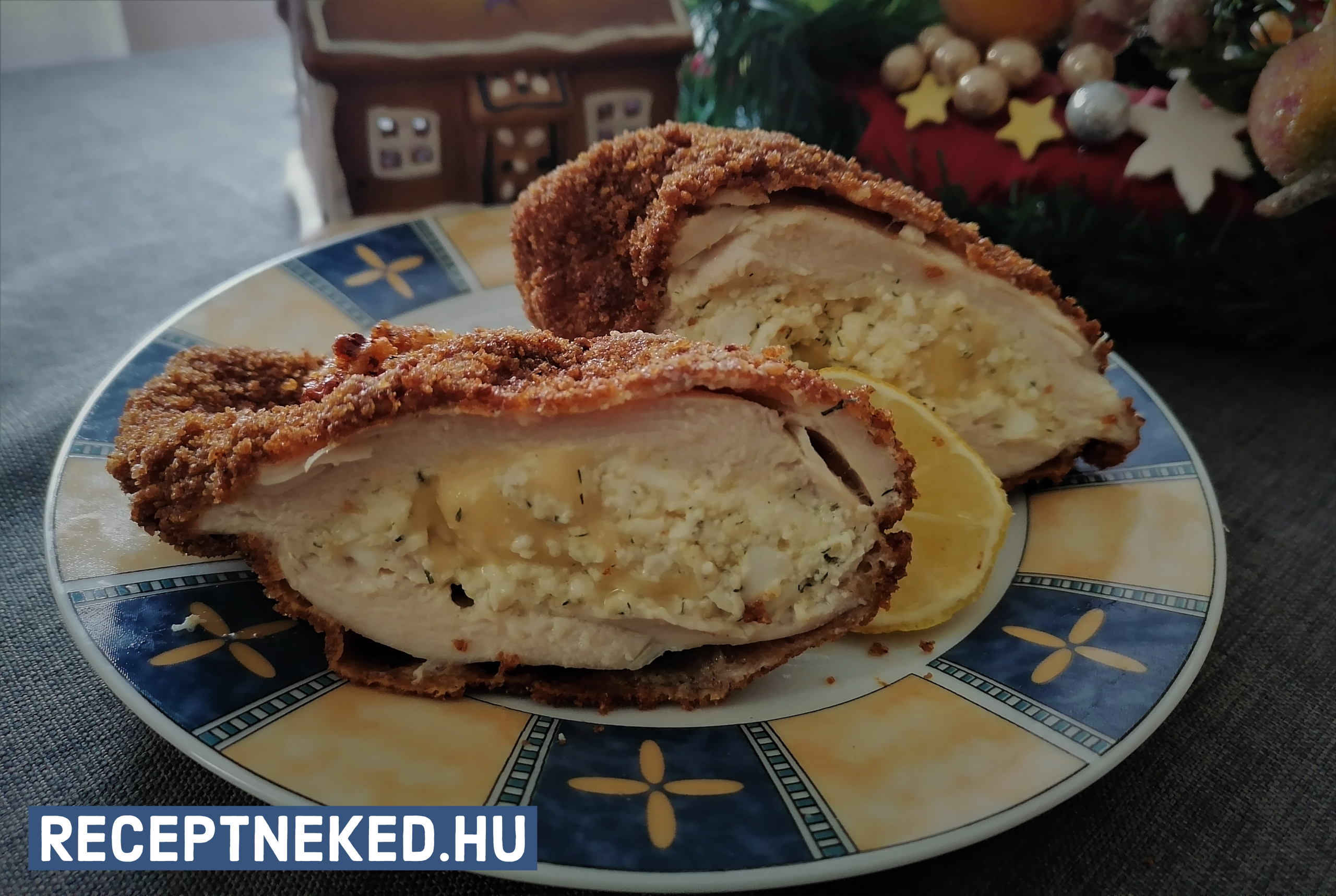 Amíg fő a karfiol és a burgul, addig a csirkemellet felszeleteljük, sózzuk, borsozzuk.