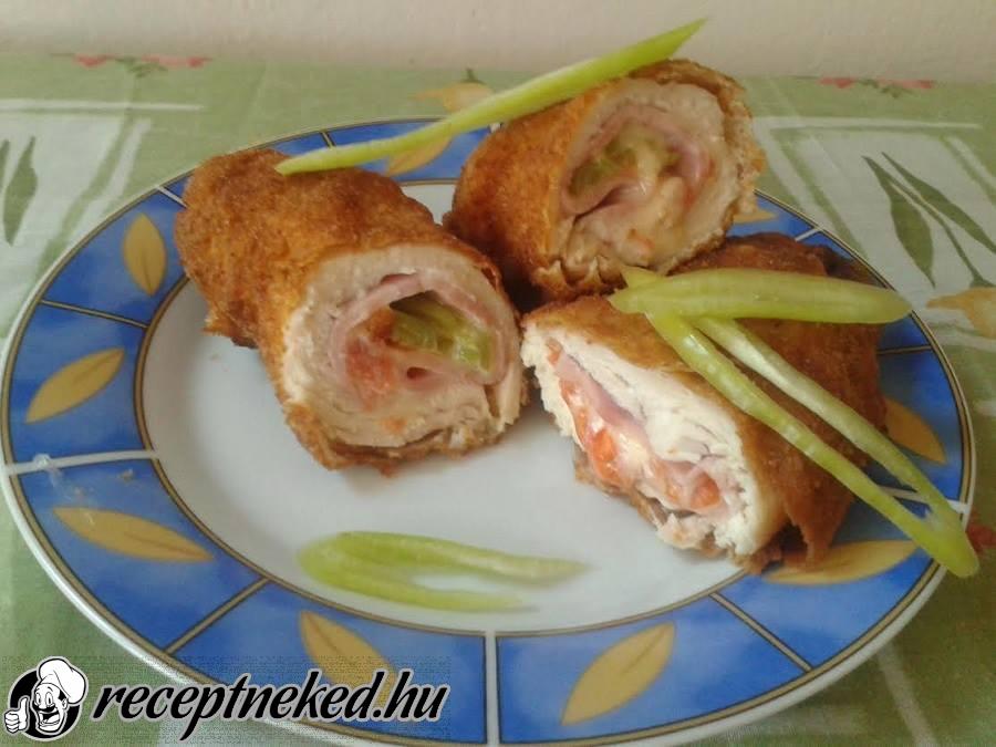 A csirkemell hosszabbik oldalát bevágjuk (zsebet vágunk), majd megtöltjük a sajtkrémmel. Fogvájóval összezárjuk a nyílást. Mindegyik csirkemellel így járunk el.
