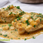 Egy tepsibe vagy jénaiba sorakoztatjuk a húsokat, felöntjük a tejszínnel és alufóliával befedjük.