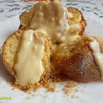 Vaníliamártással tálaljuk. A vaníliamártáshoz a hozzávalókat kevés tejjel csomómentesre keverjük, majd a többi tejet is hozzákeverjük és felfőzzük.