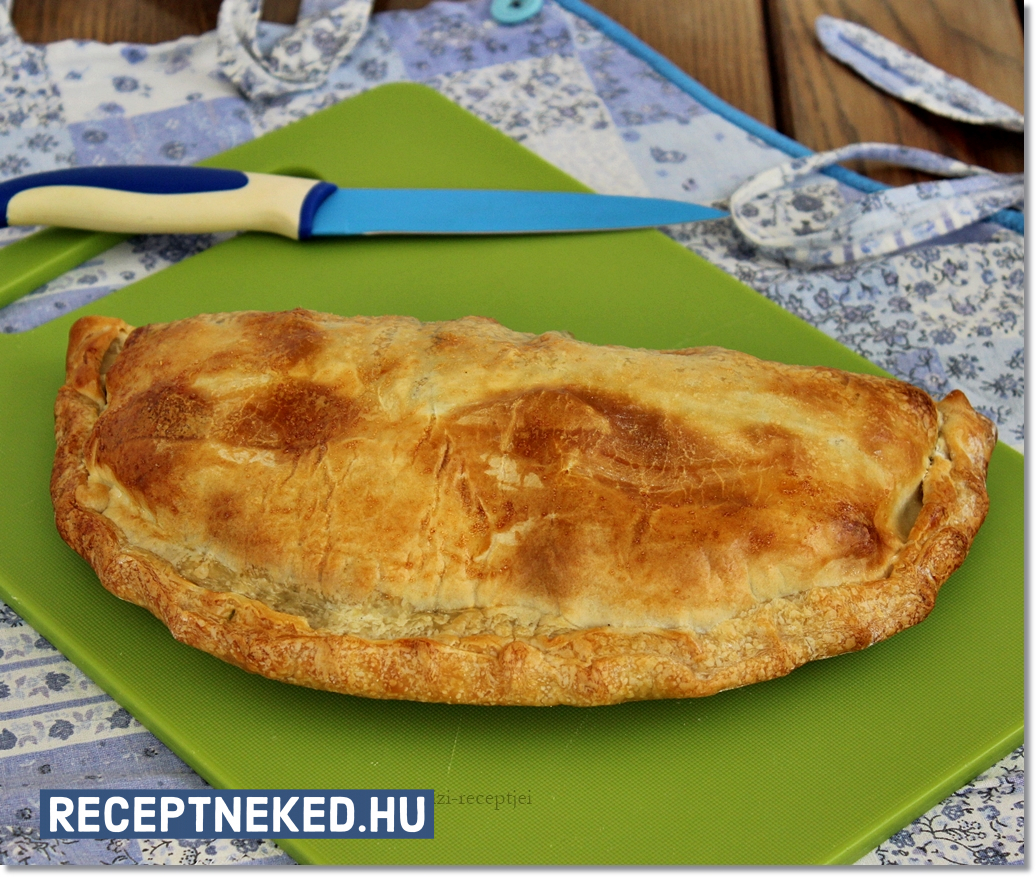Megszórjuk a felét a feltéttel, ráhajtjuk a másik felét és egy villa segítségével szépen lezárjuk a széleit, lekenjük tojássárgájával, majd megszurkáljuk a tetejét.