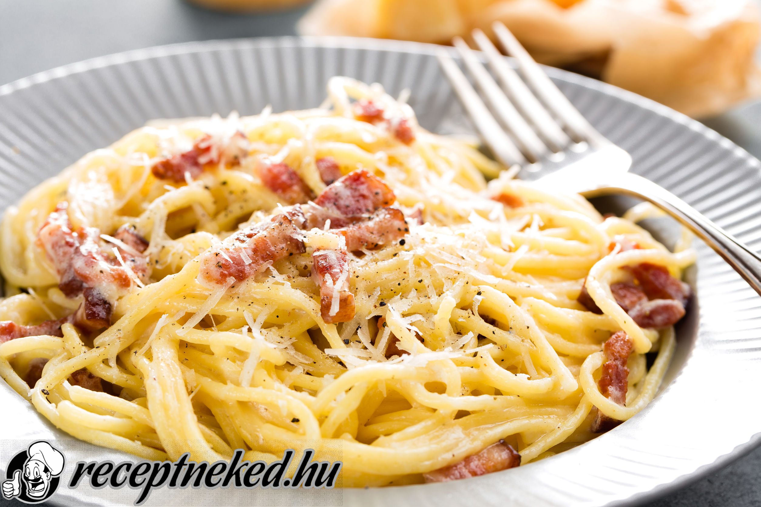 A permezánt lereszeljük, elkeverjük a tojássárgákkal és a tejszínnel, majd hozzáadjuk a baconos hagymát, majd az egészet jól összekeverjük. Ízlés szerint sózzuk és borsozzuk. A kész masszát rákanalazzuk a tésztára.