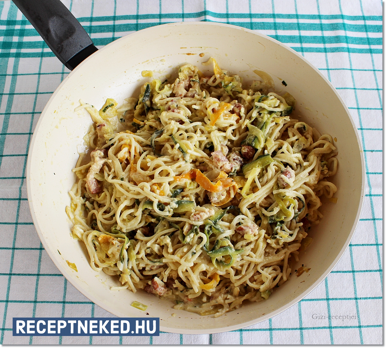 A tésztát a szokásos módon kifőzzük, majd leszűrjük és leöblítjük.