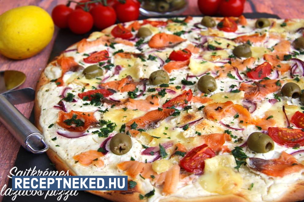 Megkenjük a tejföl és a pizza krémkeverékének a felével. A reszelő nagy lyukán ráreszeljük a párizsi felét. Megszórjuk a sajt felével.
