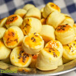 A megkelt tésztát lisztezett felületre tesszük, és kb. fél cm vastagra kinyújtjuk. Egy nagyobb szaggatóval korongokat szaggatunk, konyharuhával letakarjuk, és még 20 percet pihentetjük.