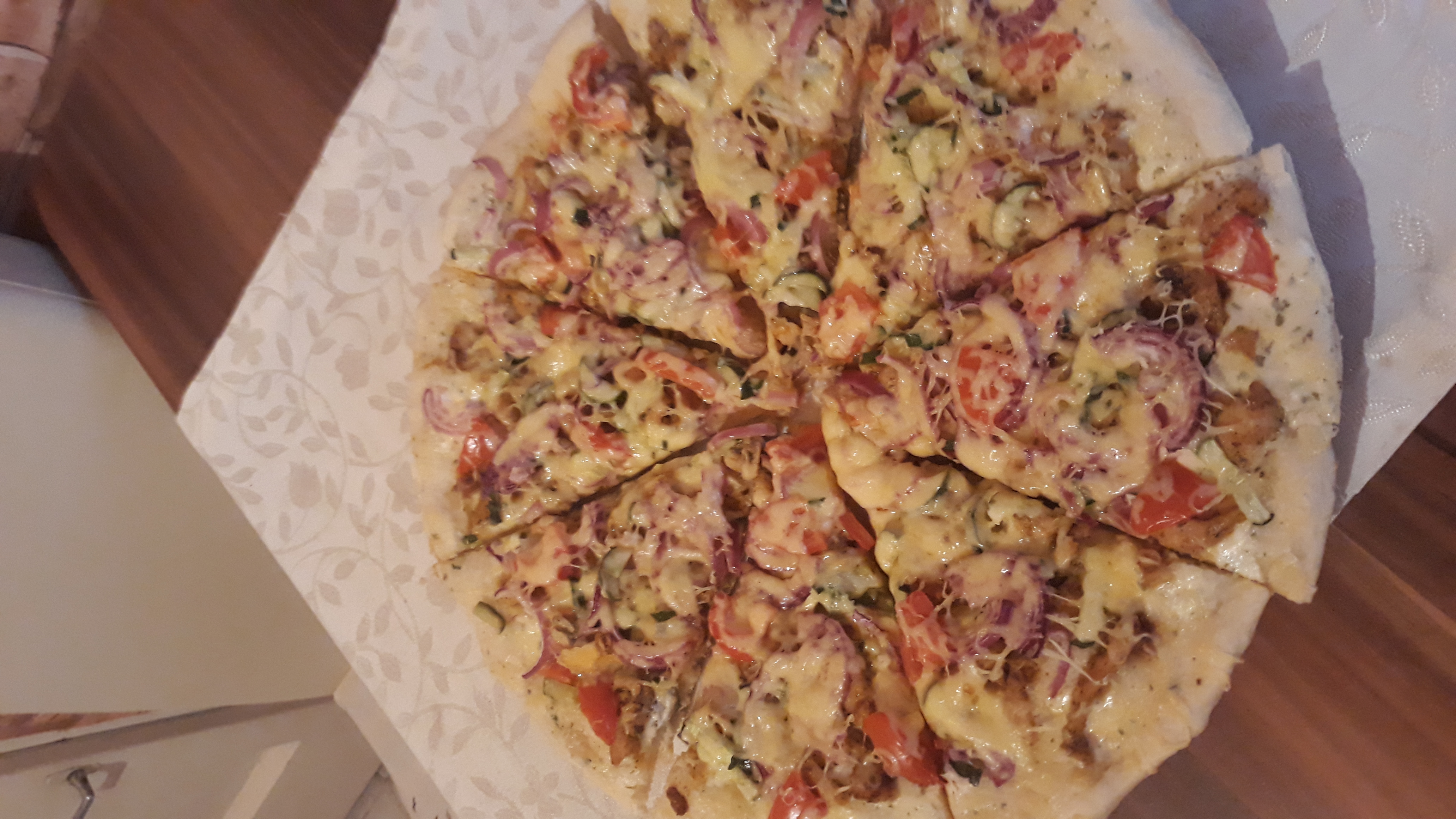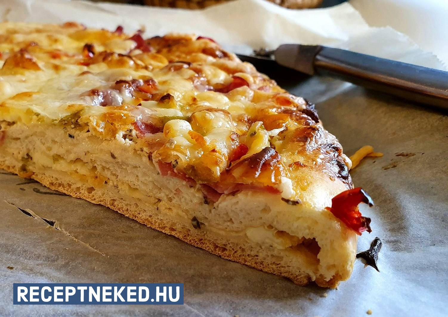 A szószt egyenletesen rákenjük a tésztára, majd rárakjuk a szalámit, a felkarikázott hagymákat, gombát, felkarikázott paprikát végül a reszelt sajttal megszórjuk.