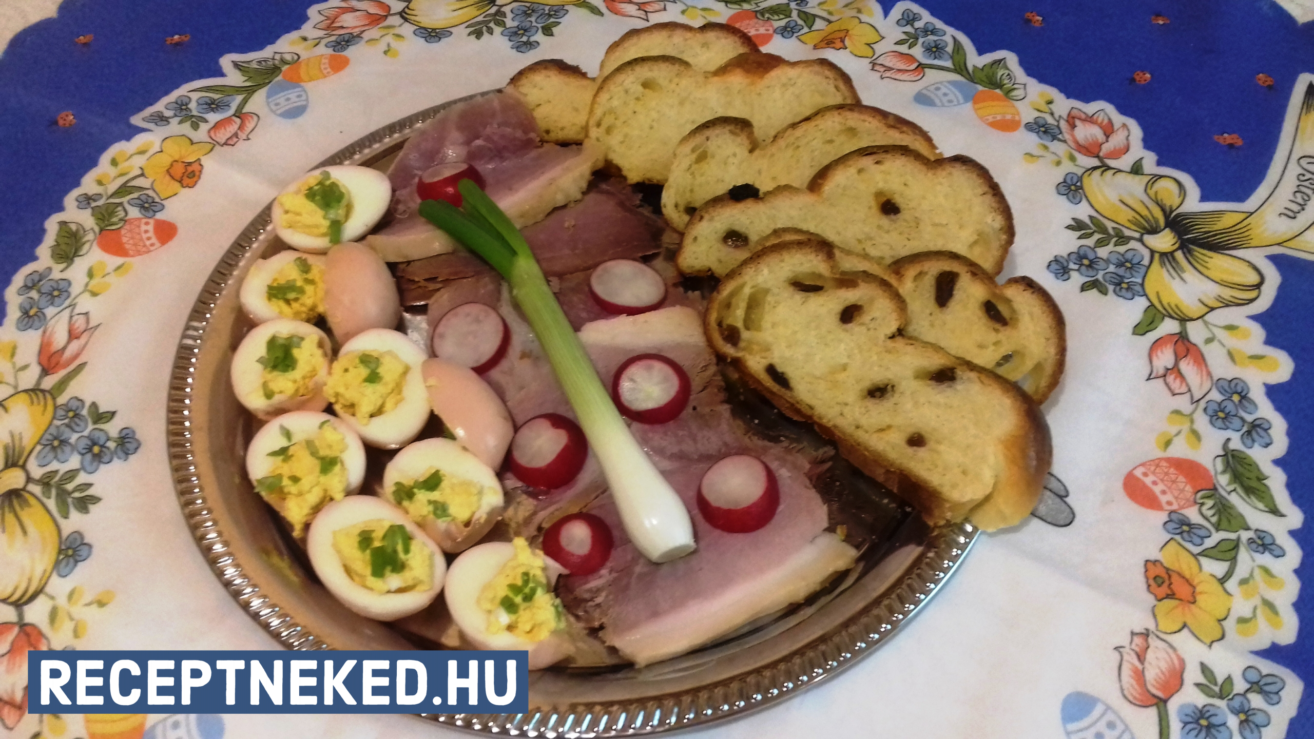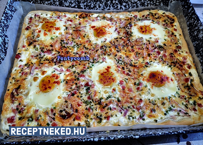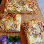 A többit lisztezett deszkán kör alakúra, vékonyra nyújtjuk. A tésztát ráemeljük a sonkára, hogy alulra kerüljön a behajtott rész. A félretett tésztából fonással, csíkokkal díszítjük.