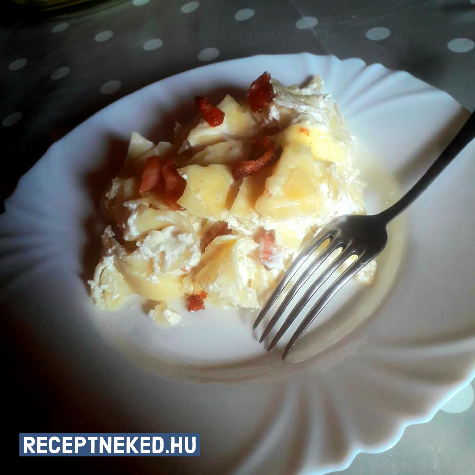 Amikor a tészta illata megjelenik, egy palacsintaforgató segítségével óvatosan megfordítjuk. A tetejére szórjuk a túrót és a kisütött szalonnadarabokat, majd megöntözzük a tejföllel. Az elkészült ételt tányérra csúsztatjuk, és azonnal tálaljuk.