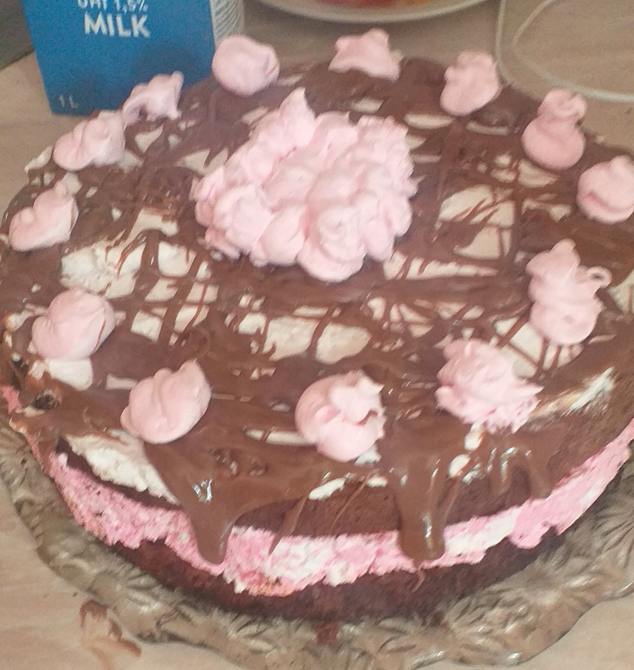 Az 1 óra leteltével felverünk 2 dl tejszínhabot, díszítőcsöves habzsákba töltjük és dekoráljuk a torta oldalán kihagyott részeket.