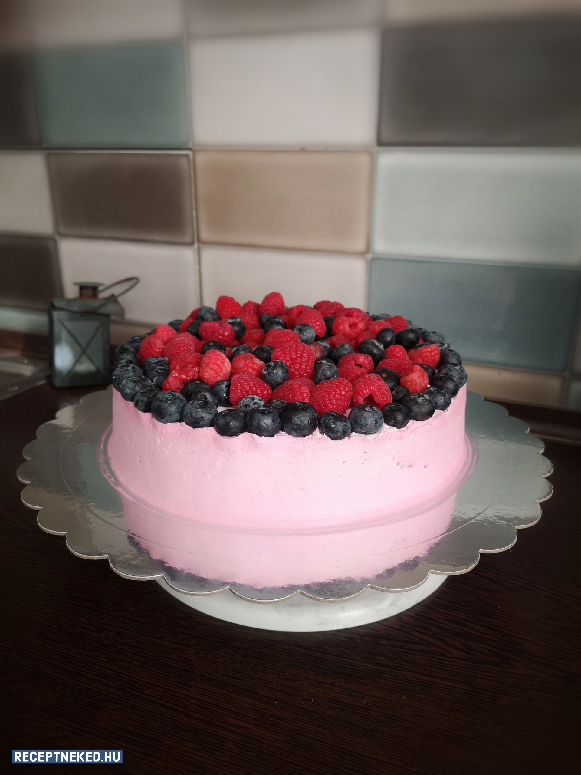 A tojásfehérjét a sóval elkezdjük habbá verni, majd amikor már félig felverődött, 2-3 részletben hozzáadjuk az átszitált keményítős porcukrot és kemény fényes habbá verjük. A habot sima csővel ellátott habzsákba rakjuk és körbe díszítjük a torta tetejét. A maradékból habkarikát süthetünk.