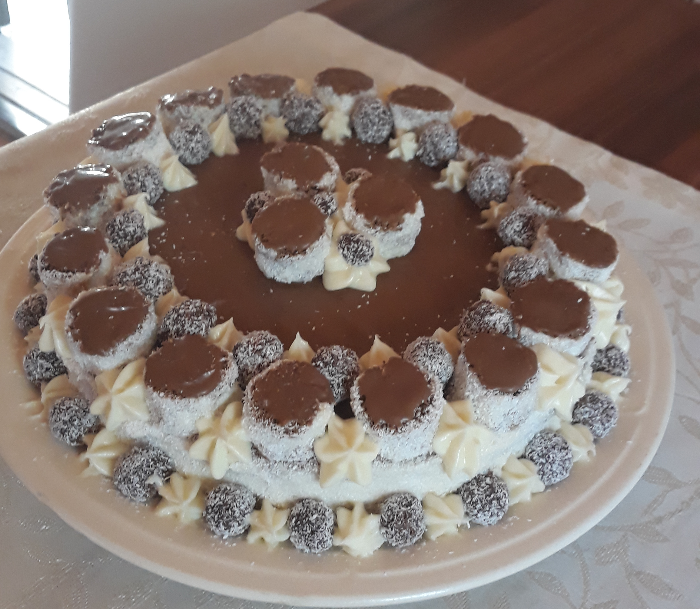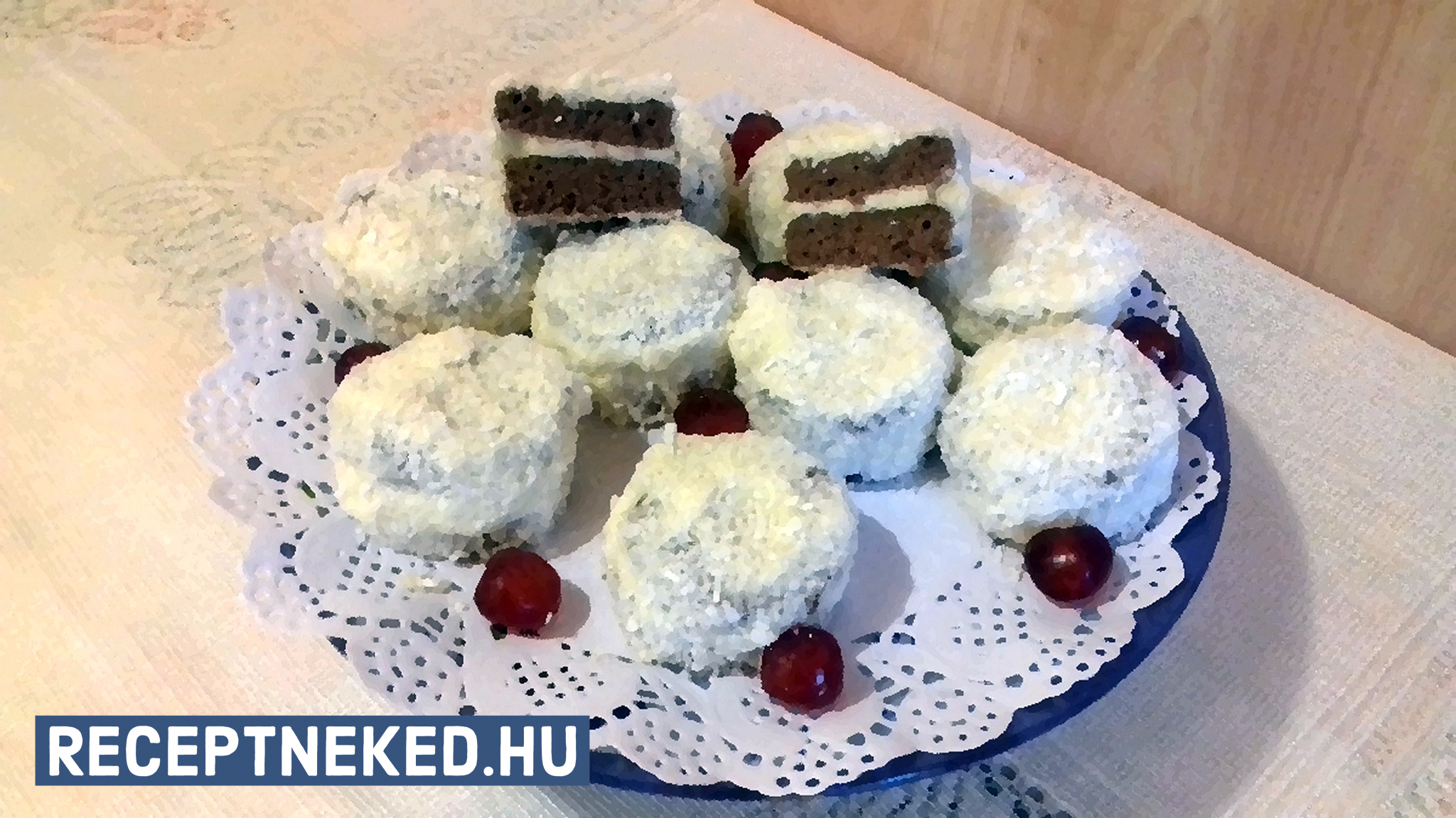 A piskóta korongokat kettévágjuk, a krémmel megkenjük, majd a másik felével összeragasztjuk. Az oldalukat is krémezzük, majd a kókuszreszelékbe forgatjuk.