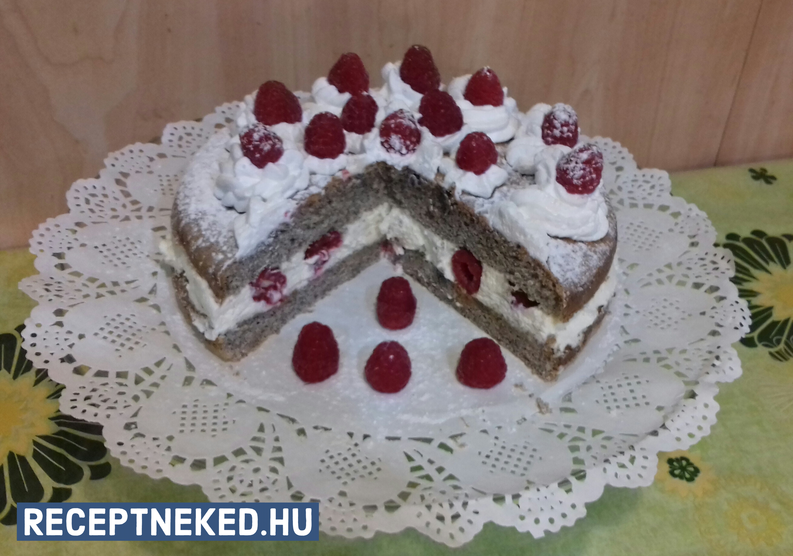 Másnap a tortaforma szélét késsel körbelazítjuk, majd eltávolítjuk a karimát. Friss málnaszemekkel díszítve tálaljuk.