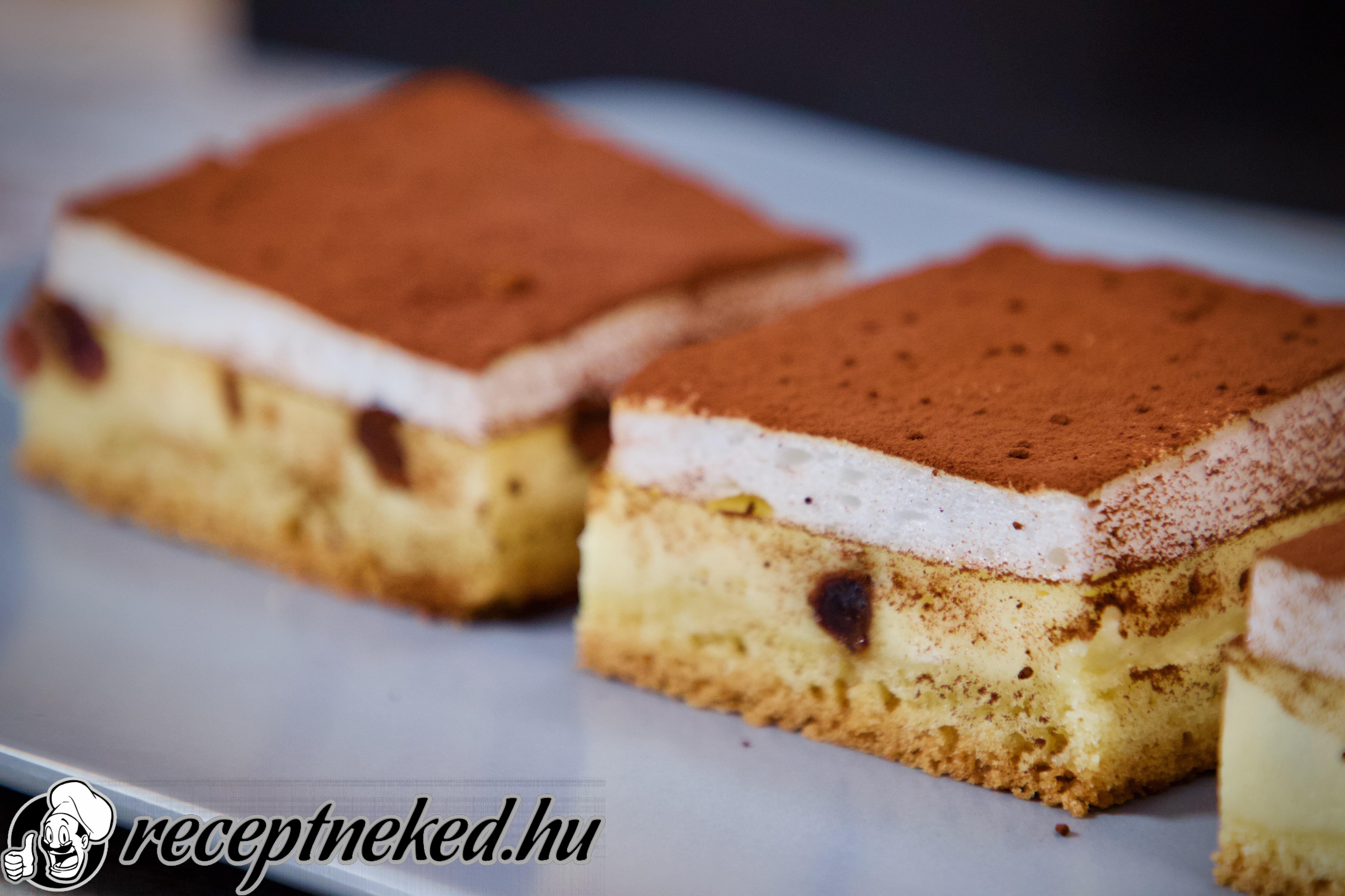 Az utolsó harmad túrós masszát áztatott piskótával rakjuk ki (ami majd a sütemény alja lesz), lezárjuk folpackkal, és minimum 5 órára a hűtő alsó részébe dugjuk.