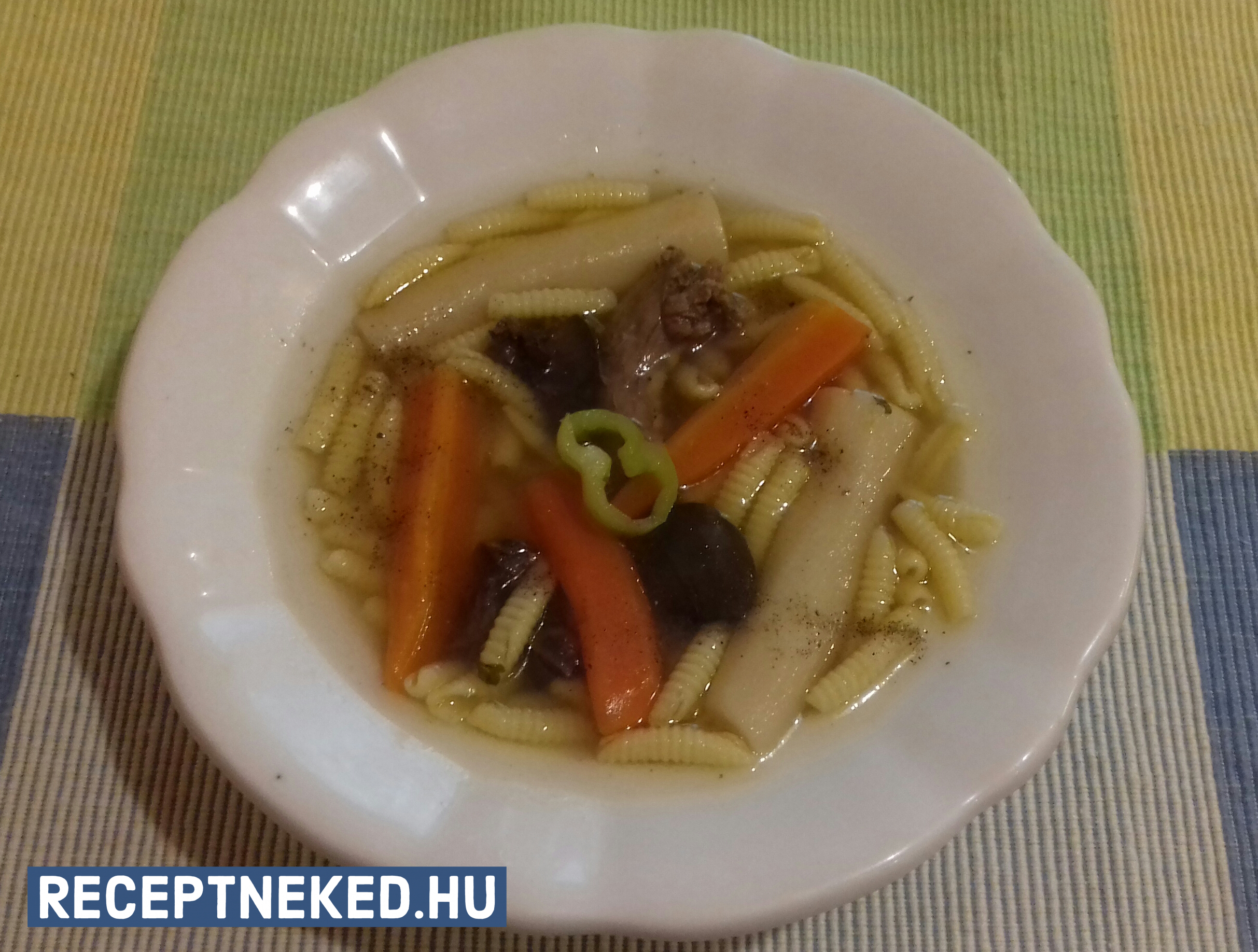 Öntsük fel annyi folyadékkal, amely kényelmesen ellepi. Adjuk hozzá a fűszereket és gyöngyözve főzzük, ameddig a hús meg nem puhul (kb 1-1,5 óra). Közben ügyeljünk a leves sósságára.